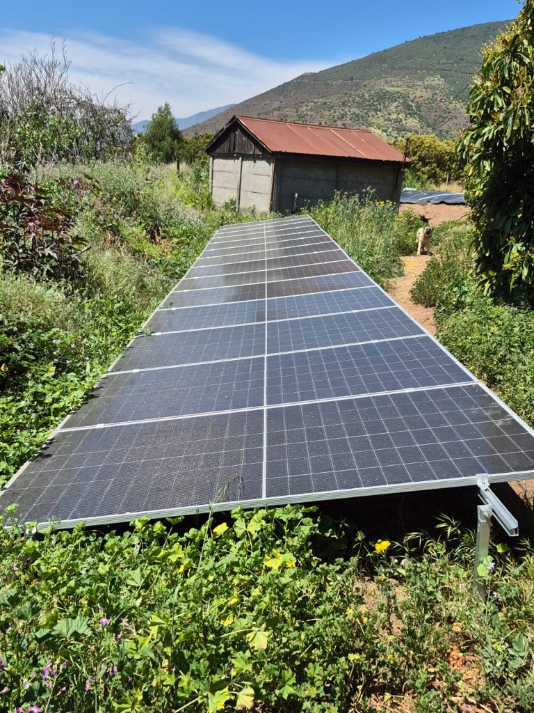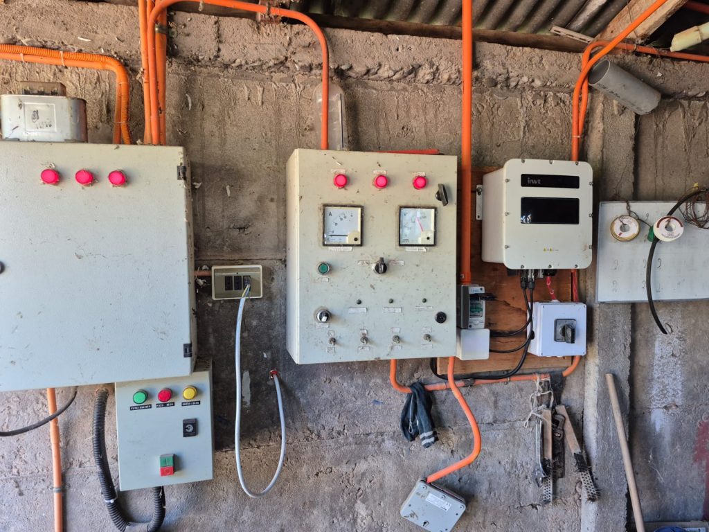 Con instalación eléctrica trifásica de chilquinta, con fuente de energía alternativa de 24 paneles solares con 2 convertidores independientes entre sí, 14 paneles para uso de la bomba de riego y 10 para el pozo profundo.