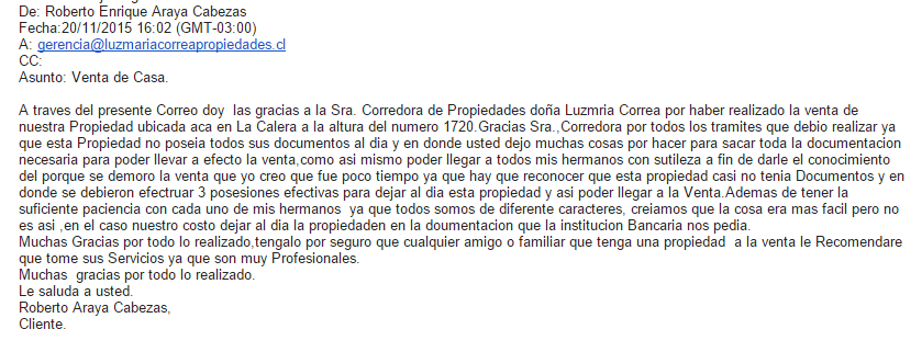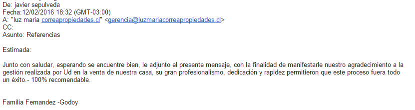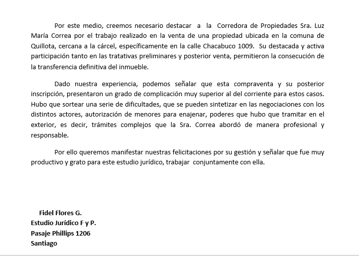 En nuestra profesión, como en todas, nuestro propósito siempre es lograr la más alta satisfacción en el servicio entregado. Por lo anterior, adjuntamos algunos ejemplos de agradecimientos que hemos recibido a lo largo de nuestra gestión.